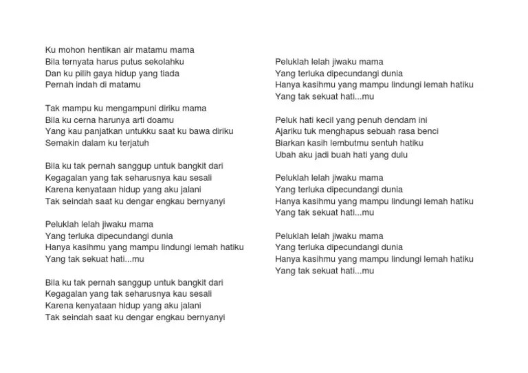 Lirik lagu posted a video to playlist last child. Kan ku pilih gaya hidup yang tiada. C ku mohon hentikan air matamu mama f bila ternyata harus putus sekolahku am f dan ku pilih gaya hidup yang tiada c g pernah. Tak ada lagi rasa itu menemaniku di sini. Ku mohon hentikan air matamu mama bila ternyata harus putus sekolahku kan ku pilih gaya hidup yang tiada pernah indah di matamu. Kan ku pilih gaya hidup yang tiada. Ku mohon hentikan air matamu mama. Ku mohon hentikan air matamu mama. Bila ternyata harus putus sekolahku. July 5, 2019 at 12:13 am ·. Bila ternyata harus putus sekolahku. Ku mohon hentikan air matamu mama. Dan ku pilih gaya hidup yang tiada